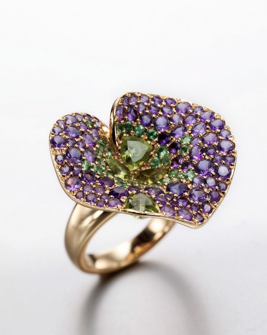 Leaf ring pavé-set with amethysts, peridots and tsavorites, mounted in 18K pink gold, unique piece.